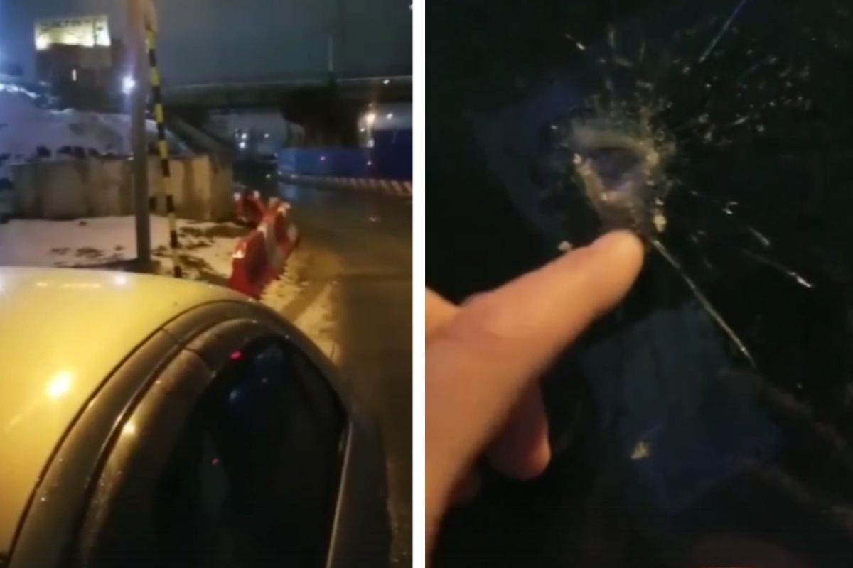 «Ехал со стороны Речного, повернул на Ипподромскую. Оттуда, где проходит путепровод для поездов, что-то упало с таким грохотом. Лобовуха под замену, почти насквозь», — комментирует мужчина за кадром.