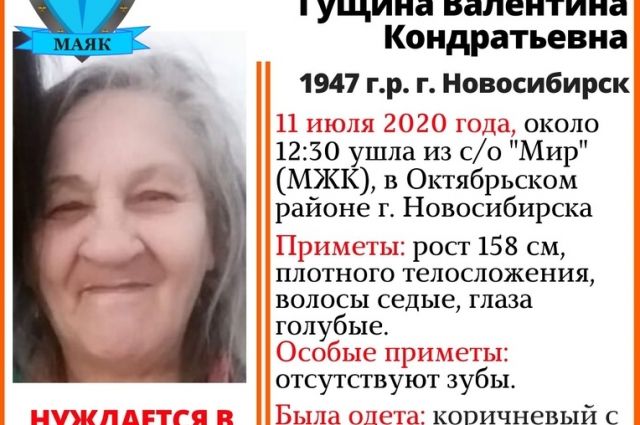 В Октябрьском районе Новосибирска пропала 73-летняя женщина без зубов, об этом сообщили волонтёры поискового отряда «Маяк» на своей странице в соцсети «Вконтакте».