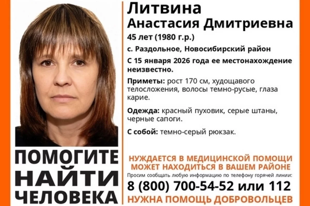В селе Раздольное под Новосибирском без вести пропала 45-летняя Анастасия Литвина. Как сообщили в поисково-спасательном отряде (ПСО) «ЛизаАлерт», с 15 января 2026 года ее местонахождение неизвестно, поэтому на поиски отправились волонтеры.