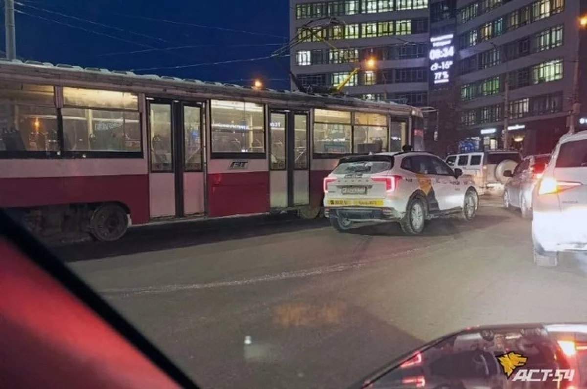 Утром 2 февраля на площади Калинина в Новосибирске произошло ДТП: трамвай притёрся с кроссовером Haval Jolion, оформленным под такси «Яндекс Go».