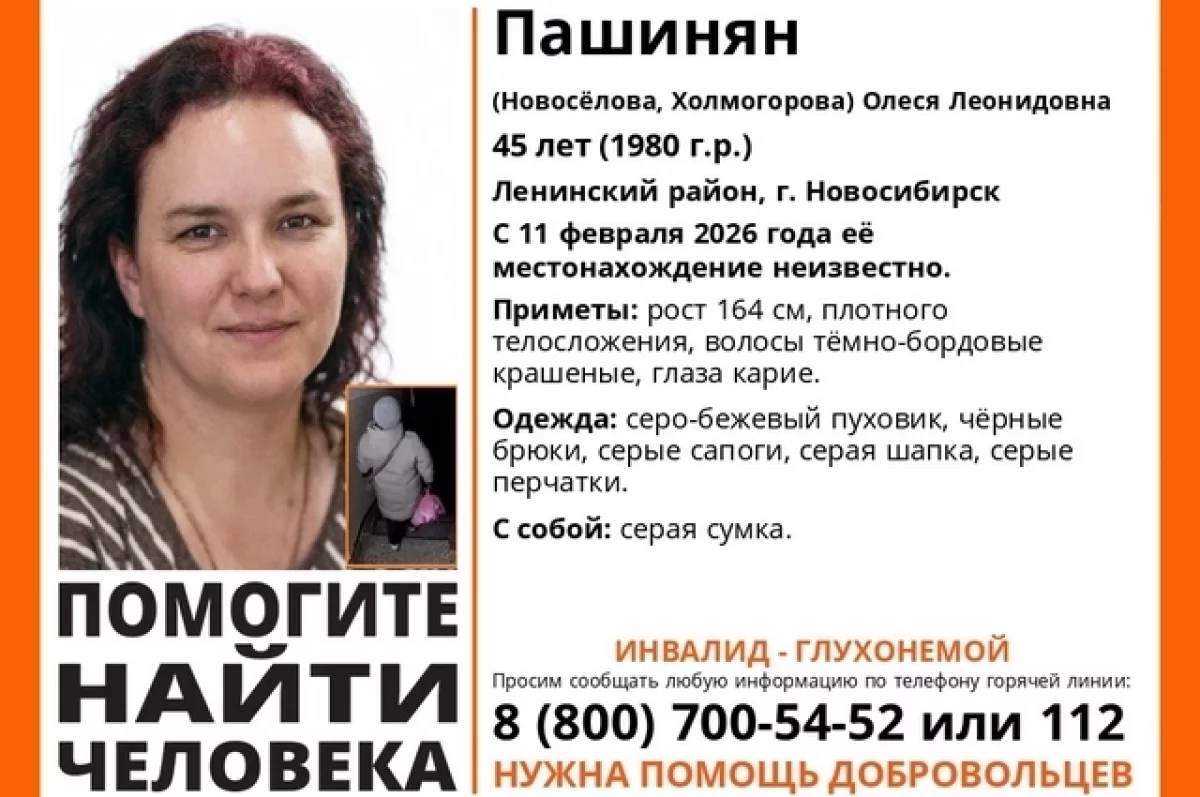 В Ленинском районе Новосибирска без вести пропала 45-летняя Олеся Пашинян. Как сообщили в поисково-спасательном отряде (ПСО) «ЛизаАлерт», с 11 февраля 2026 года ее местонахождение неизвестно, поэтому на поиски отправились волонтеры.