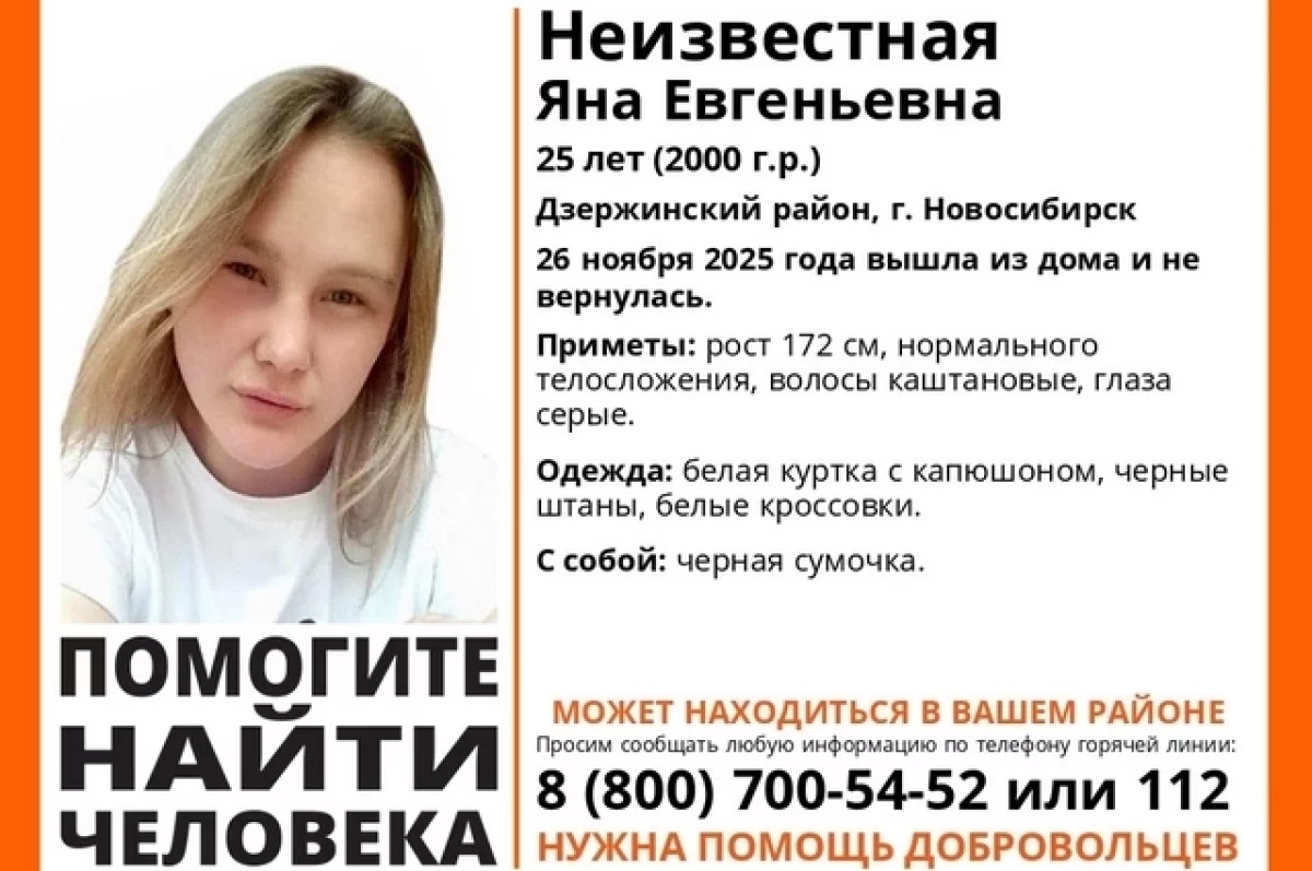 В Дзержинском районе Новосибирска без вести пропала 25-летняя Яна Неизвестная. Как сообщили в поисково-спасательном отряде (ПСО) «ЛизаАлерт», 26 ноября 2025 она вышла из дома и не вернулась, поэтому на поиски отправились волонтеры.