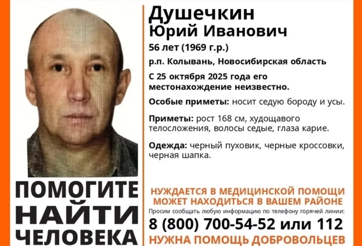 В рабочем поселке Колывань Новосибирской области без вести пропал 56-летний Юрий Душечкин. Как сообщили в поисково-спасательном отряде (ПСО) «ЛизаАлерт», с 25 октября 2025 года его местонахождение неизвестно, поэтому на поиски отправились волонтеры.