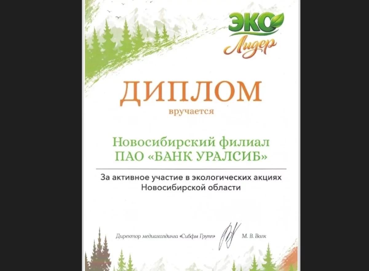 23 апреля в Международном выставочном комплексе «Новосибирск Экспоцентр» в рамках официального открытия выставки «Активный отдых: охота, рыбалка, туризм в Сибири» состоялась церемония награждения компаний региона премией «ЭКО Лидер». Новосибирский филиал Банка Уралсиб получил награду «За активное участие в экологических акциях Новосибирской области».