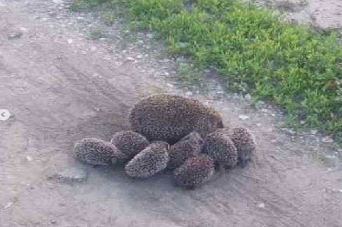 На кадрах, опубликованных в Сети, видно, как мама-ежиха ведет за собой малышей размером поменьше. Встреча с людьми оказалась стрессом для млекопитающих, поэтому они предпочли удалиться.