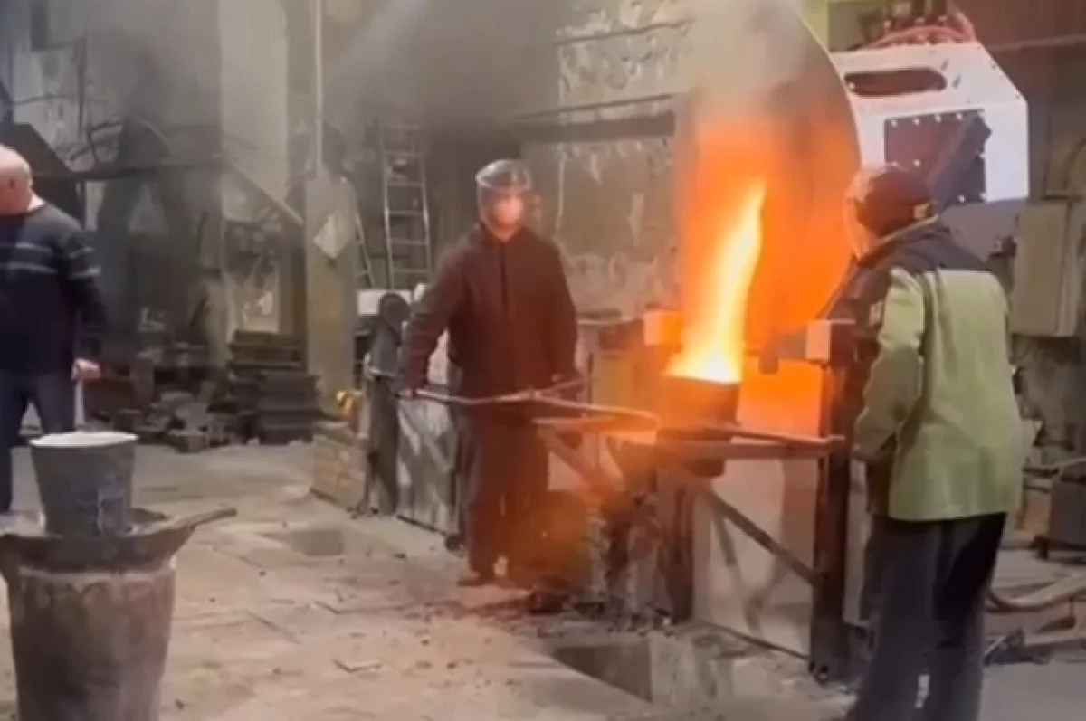 На опубликованном видео видны рабочие, переливающие раскаленный металл, после чего происходит мощная вспышка.