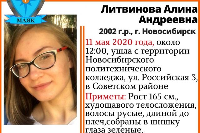 В Новосибирске нашли живой пропавшую 11 мая 17-летнюю студентку Алину Литвинову, об этом на своей странице в социальной сети «Вконтакте» сообщил поисковый отряд «Маяк».