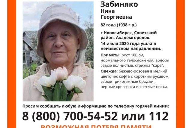Нина Забиняко пропала 14 июля в Советском районе Новосибирска, в Академгородке. С тех пор о ней не было никакой информации.