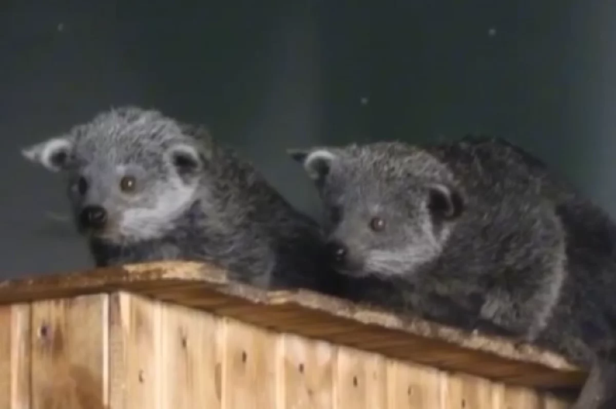 В Новосибирском зоопарке показали видео редкие кадры с детёнышами бинтуронгов. Они уже подросли и вовсю играют и снуют по вольеру.