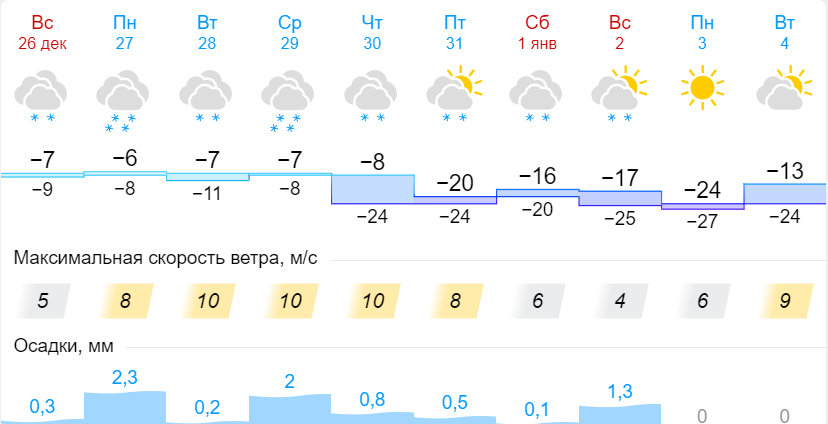 Самым морозным днем недели станет воскресенье, 2 января, когда ночью термометры покажут -25 градусов, днем будет около -17. Морозная погода, судя по прогнозу, простоит вплоть 4 января.