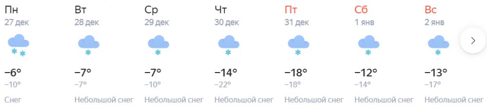 Яндекс.Погода также обещает похолодание в четверг, 30 декабря. Ночью термометры покажут около -22. Однако в дальнейшем сильных морозов сервис не обещает.