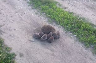 Мама-ежиха и семь ежат вышли на прогулку на проселочной дороге и попали на видео.